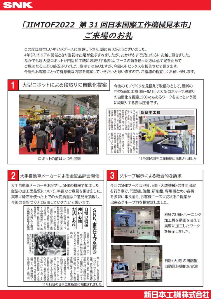 SNK | 新日本工機株式会社 > ニュース > 展示会情報 > 「JIMTOF2022 第31 回⽇本国際⼯作機械⾒本市」 ご来場のお礼 ニュース 2022.11.21 展示会情報 「JIMTOF2022 第31 回⽇本国際⼯作機械⾒本市」 ご来場のお礼 この度はお忙しい中SNKブースにお越し下さり、誠にありがとうございました。 4年ぶりのリアル開催となり当初は出足が危ぶまれましたが、おかげさまで沢山の方にお越し頂きました。 なかでも超大型ロボットが門型加工機に段取りする姿は、ブースの前を通った方は必ず足を止めて ご覧になるほどの盛況ぶりでした。簡単ではありますが、今回のトピックスを報告させて頂きます。 今後もお客様にとって有意義な内容を提案していきたいと思いますので、ご指導の程宜しくお願い致します。