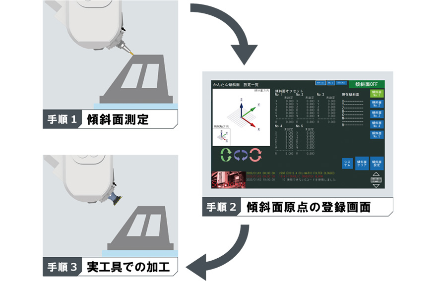 傾斜面加工時に課題となる複雑な補正や煩雑な加工原点設定など、角度考慮が必要なプログラムなどを簡単に行えるサポート機能が搭載可能です。5面加工機をお使いの方にも抵抗を感じることなく操作して頂けます。